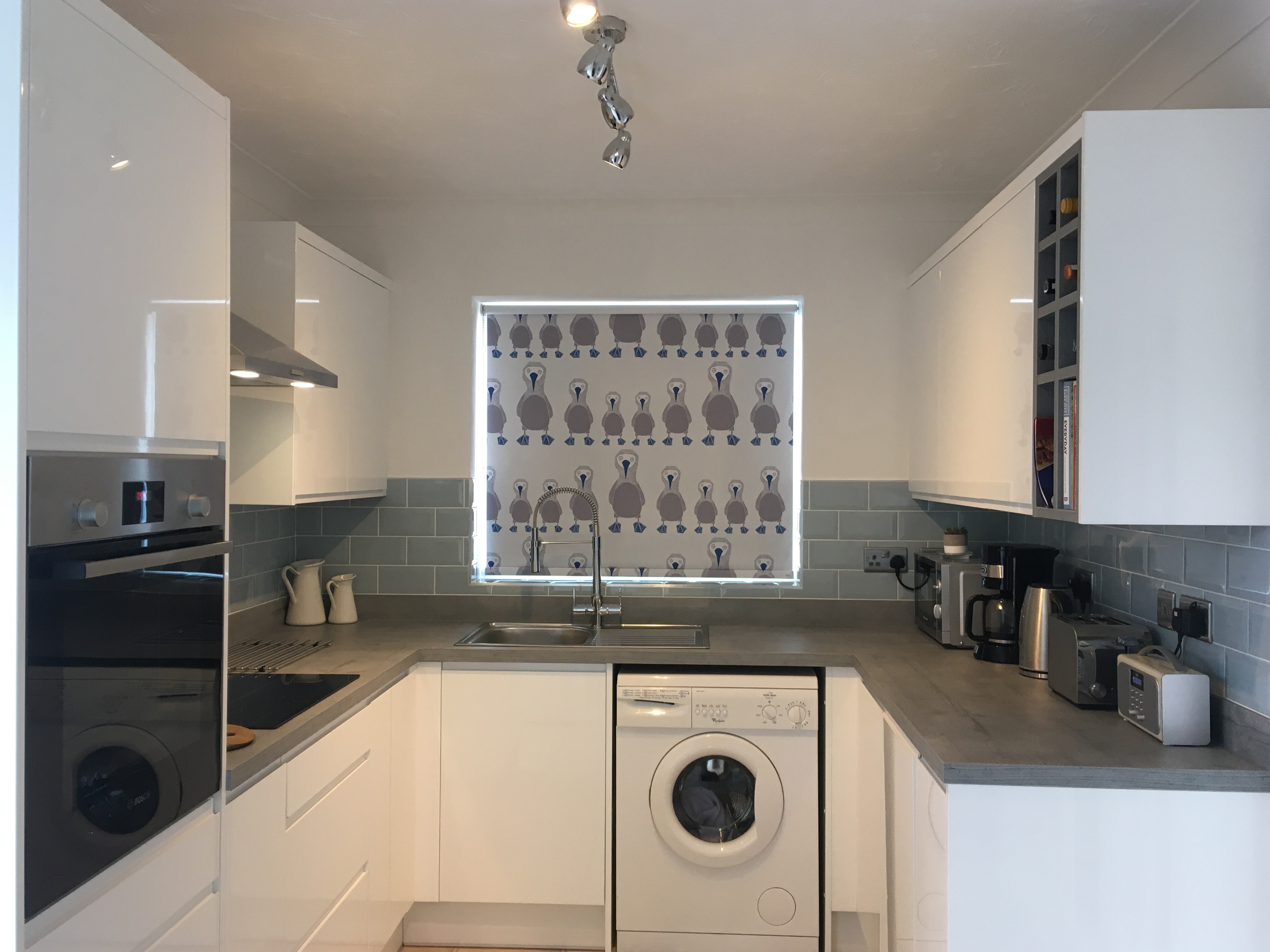 Downstairs, the private front door opens into a generous hallway leading to the upper floor. The hall flows into a bright, open-plan living/dining room with a large wood burner and access to a downstairs WC/cloakroom. The newly fitted kitchen at the back of the cottage includes a Bosch electric oven/grill, Bosch induction hob, dishwasher, fridge/freezer, microwave, filter coffee machine, toaster, Nespresso machine, kettle, and washing machine.